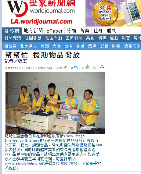 2012-10-24 世界新聞網-幫幫忙援助物品發放By sw / October 24, 2012 2012-10-25 Article at Sina News-送愛到多明尼加 幫幫忙基金會月底運送物資