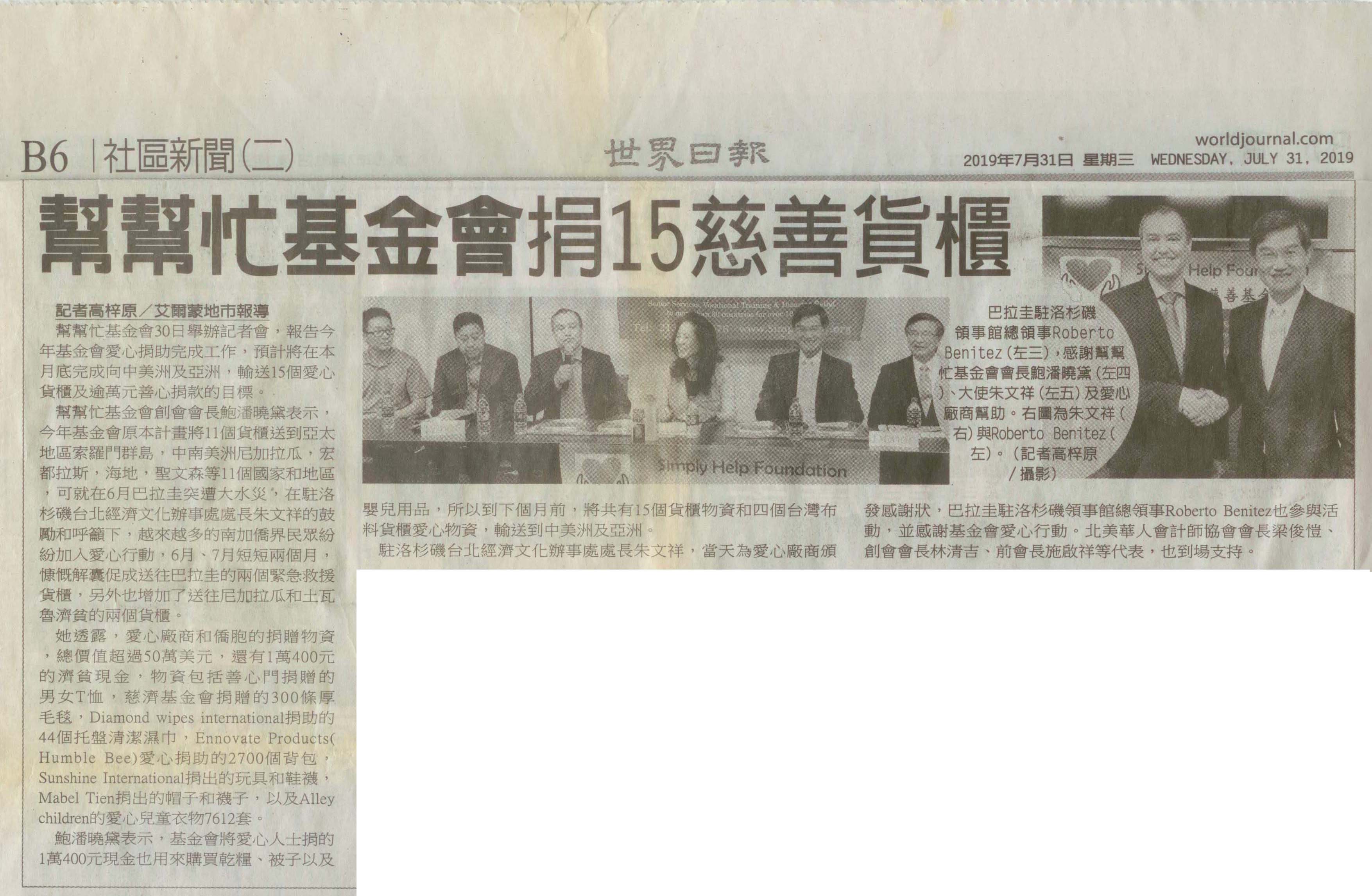 2019 7/31 Worldjournal News 2018 12/16 幫幫忙基金會 發放耶誕節禮品-WorldJournal News 2018 12/16 幫幫忙基金會物資發放 呼籲低收入華裔家庭聯繫- SingTao News 2018 9/22 幫幫忙基金會成立20年 繼續送愛 2018 7/29 Homeless Shelter Distribution 2018 7/30 NTDTV news-捐助游民爱心物品 帮帮忙又帮忙 2018 4/26 Worldjournal News 2018 4/17 Hinet News – 我旅美慈善機構幫幫忙基金會捐贈薩國第一夫人辦公室人道援助物資 2018 2/7 幫幫忙基金會 募教育類物資 -World Journal News 2018 2/7 NTDTV news-280貨櫃助31國 「幫幫忙」需儲存空間 ← Previous 1 … 9 10 11 … 25 Next →