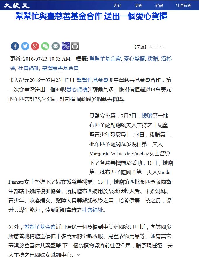 2016 07/23 中天北美新聞-幫幫忙」攜手台灣慈善基金會送愛心到薩爾瓦多