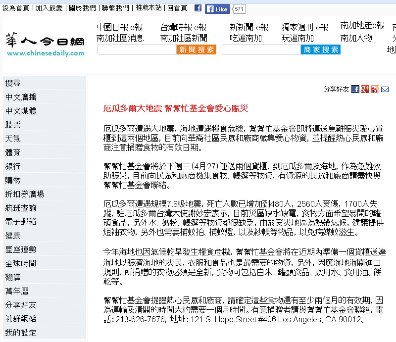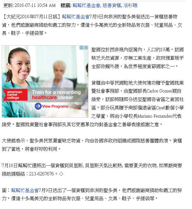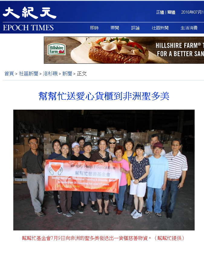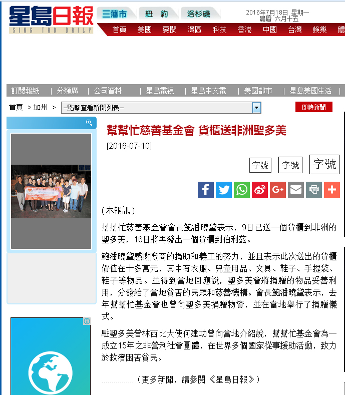 2016 7/16 幫幫忙基金會送愛心貨櫃到貝里斯 2016 7/13 幫幫忙基金會愛心貨櫃送非洲聖多美(環球通訊社) 2016 7/13 台灣旅美幫幫忙基金會援贈薩國布匹(宏觀僑務新聞網) 2016 7/11 EPOCH TIMES 2016 7/9 幫幫忙慈善基金會 貨櫃送非洲聖多美 (Sing Tao News) 2016 4/30 Worldjournal News-2貨櫃賑災 幫幫忙送暖 2016 4/25 Chinese Daily News-厄瓜多爾大地震 幫幫忙基金會愛心賑災 2016 3/10 Local IWitness News in St Vincent 2016 2/26 Worldjournal News-幫幫忙基金會 薩國政府肯定 2016 2/25 『幫幫忙基金會』薩國行善15載 獲薩國會褒揚狀 ← Previous 1 … 14 15 16 … 25 Next →