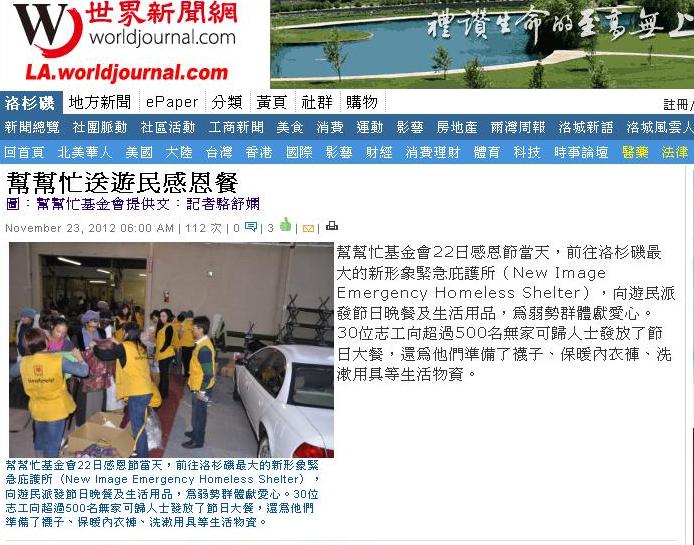 2012-11-23 Article at Worldjournal-幫幫忙送遊民感恩餐